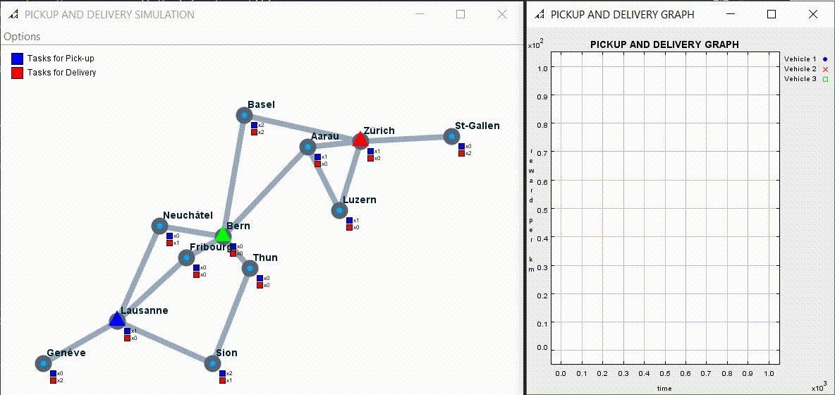 In the simulation, delivery drivers have to take care of packages. Each package must be picked up in one city and delivered in another. In addition, each task has a weight and each delivery driver has a maximum weight he can carry.