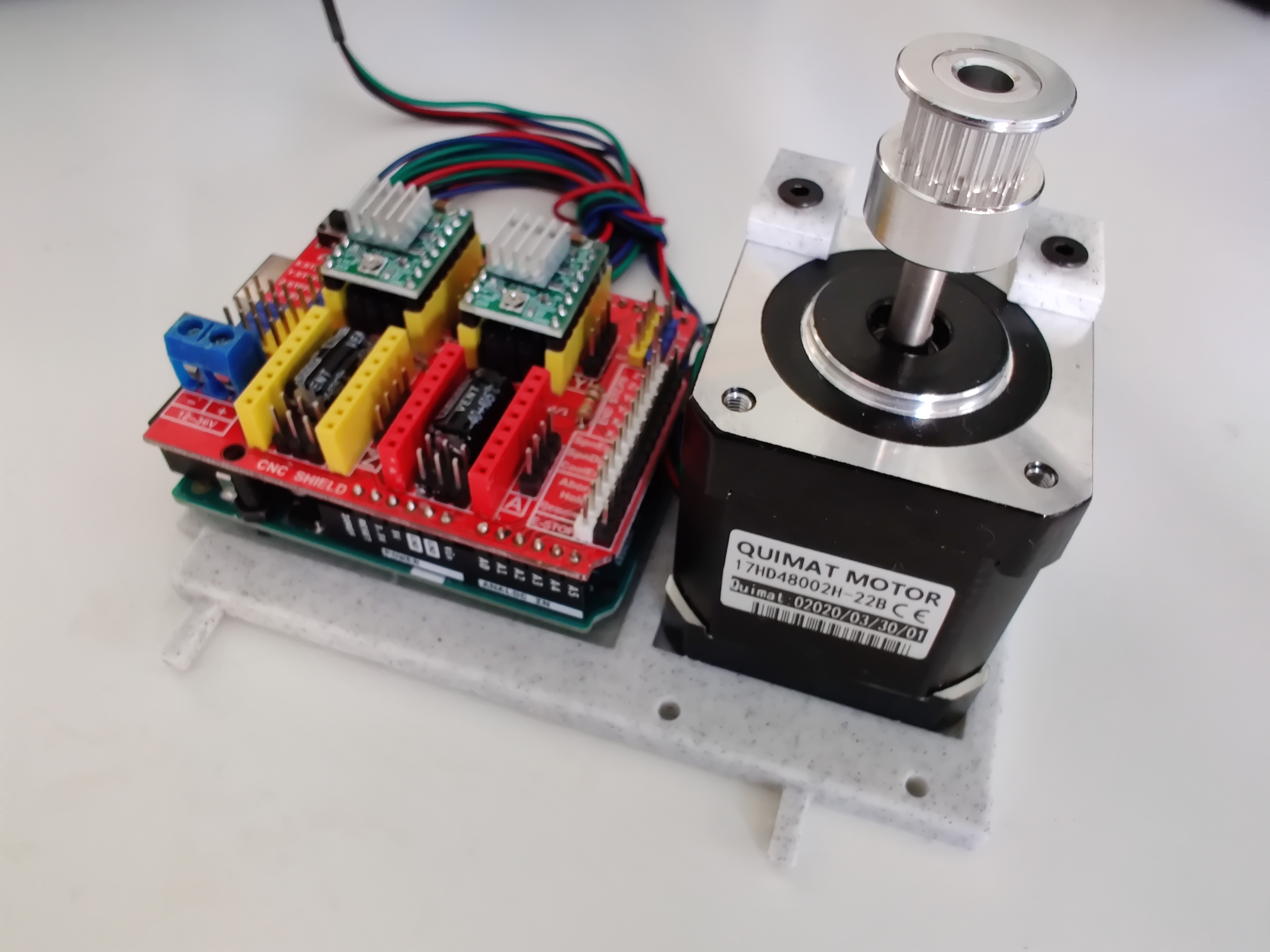 Many solutions exist to control such a machine with two stepper motors and a servo. I chose to use an arduino, a CNC shield (a board designed to control a CNC machine) and two a4988 drivers motor.