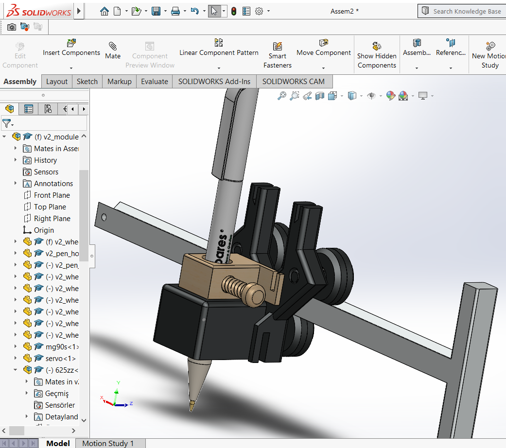 For this version, instead of showing a simple feature used when creating a part, I wanted to show how to build a complete assembly composed of several parts. I chose to record how I built the module that holds the pencil because it was the most complete part of the machine. It’s a 1h video that I accelerated to a few minutes: