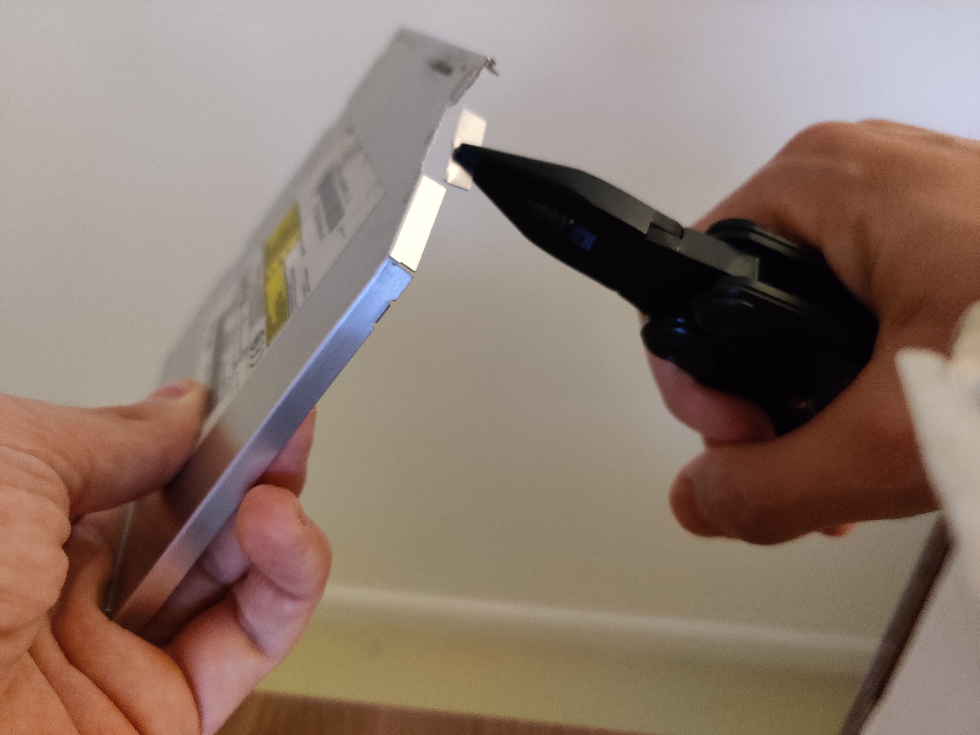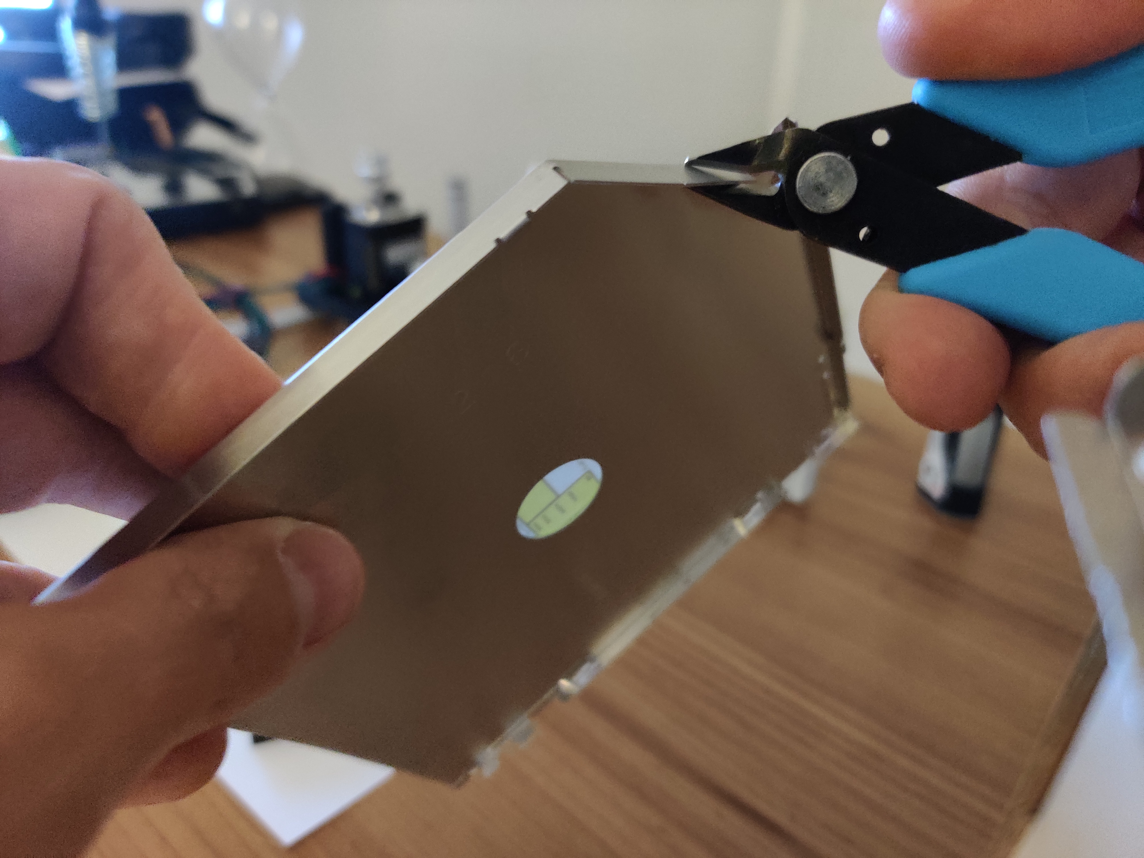 Once the two axes are assembled, the belts can be added. First of all, to avoid using glue, we need an aluminum piece to be added at both ends of the belt. This aluminum piece will allow the belt to get stuck in the notches: