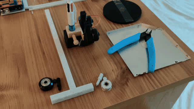 Then, I decided to create another version which does not need profiles. This is a smaller version more portable and completely printable in 3D. This version fit more my usecase of having a machine I can assemble in a few minutes. The following animation shows how light the machine is: