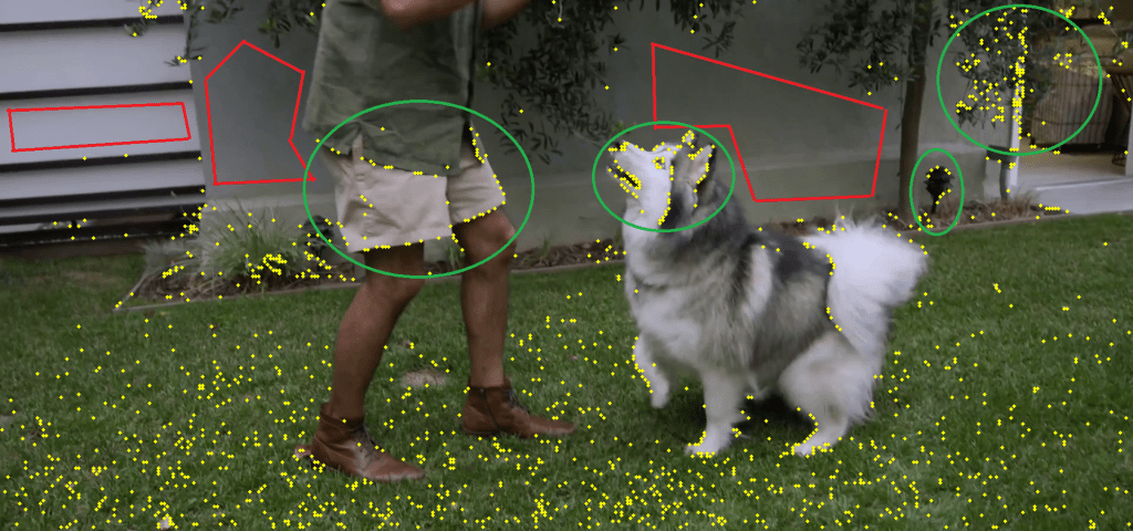 - Example with a static threshold: many more keypoints are found in the grass close to the camera