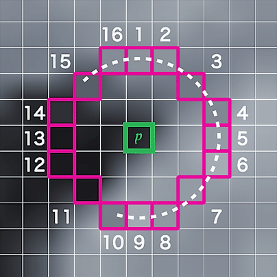 To calculate whether a certain pixel p is a key point, FAST examines 16 pixels (following a circle) around it and checks if at least 12 pixels have a value above or below the value of the pixel p by a threshold: