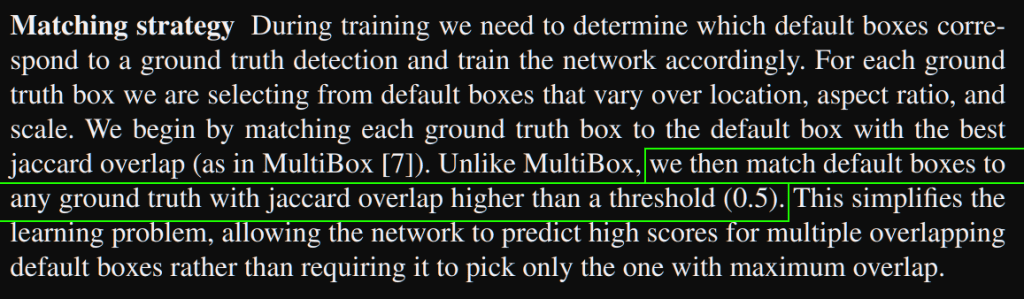 - Matching strategy: must determine which default boxes correspond to the ground truth one. This selection starts with the best jaccard overlap, then all boxes with a jaccard overlap > 0.5. This simplifies the learning problem, allowing the network to predict high scores for multiple overlapping default boxes rather than requiring picking only the one with maximum overlap.