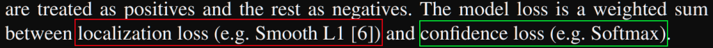 - The loss is a weighted sum between localization loss (smooth L1) and confidence loss (softmax loss: softmax activation + cross entropy loss)