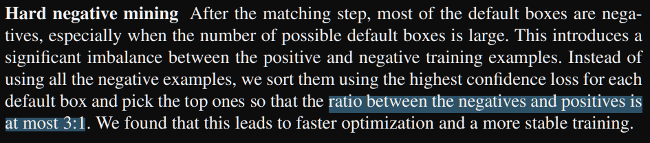 - Hard negative mining: after matching step most of the boxes are negatives, this leads to significant imbalance between positive and negative training examples. Instead of using all negative examples, they are sorted using the highest confidence loss for each default box and pick the top ones so that the ratio neg/pos is at most 3:1 (produce faster optimization and more stable training)