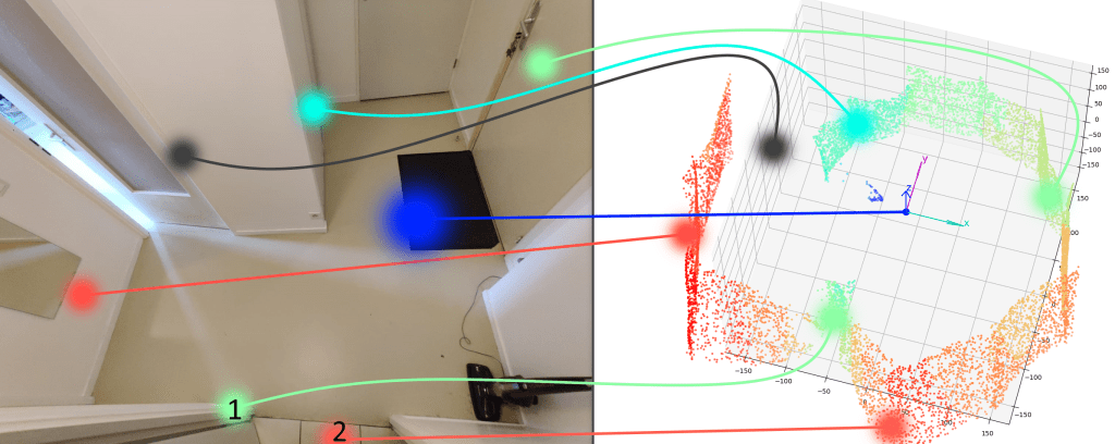From the point of view of the robot, it cannot see the black part so it stayed empty in the 3D scene. We can also notice that the angle of the hinges (number 1) was also mapped. We got a good angle for the door in orange (between number 1 and 2). The rest of the hall is recognizable but the walls are a bit curved instead of straight.