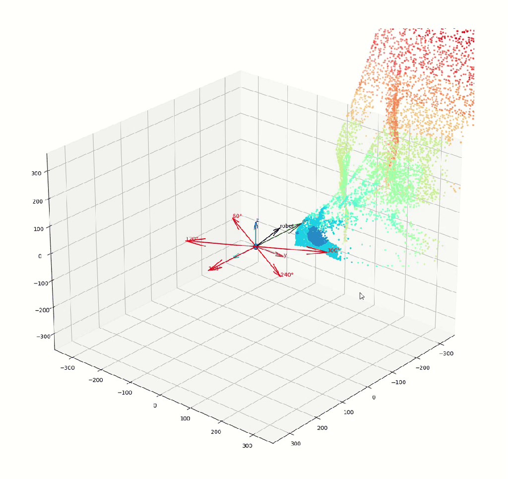 In the above visualization, we can see that the points are projected along the good direction following the robot orientation (black arrow). Everything seems to work fine, we can now move on real tests.