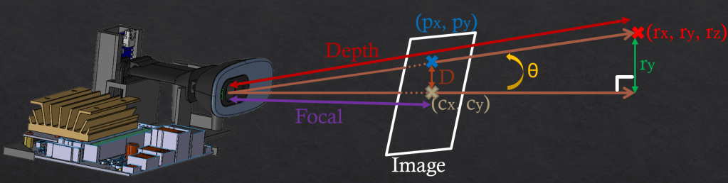 In the illustration above, we want to convert the 2D point (px, py) to the 3D point (rx, ry, rz) thanks to the depth value. To do so, we need to get the focal and the D value: