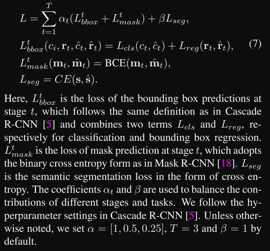All the modules described above are differentiable, Hybrid Task Cascade (HTC) can be trained in an end-to-end manner. At each stage t, the box head predicts the classification score ct and regression offset rt for all sampled RoIs.