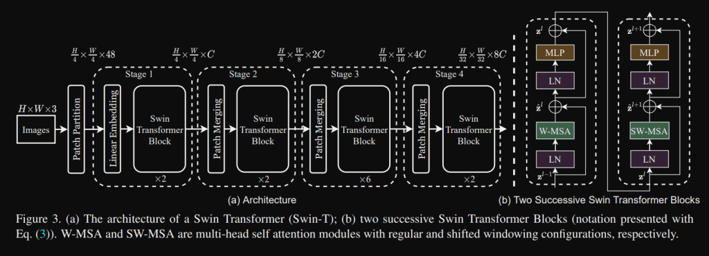 This hierarchical architecture has the flexibility to model at various scales and has linear computational complexity with respect to image size. These qualities of Swin Transformer make it compatible with a broad range of vision tasks, including image classification and dense prediction tasks such as object detection and semantic segmentation.