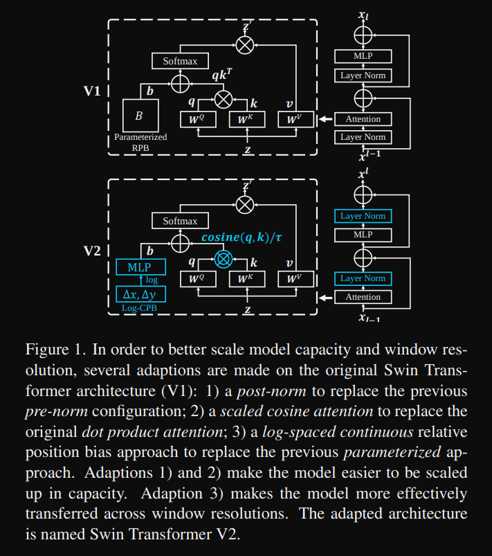 They also proposed a scaled cosine attention to replace the previous dot product attention. The scaled cosine attention makes the computation irrelevant to amplitudes of block inputs, and the attention values are less likely to fall into extremes.