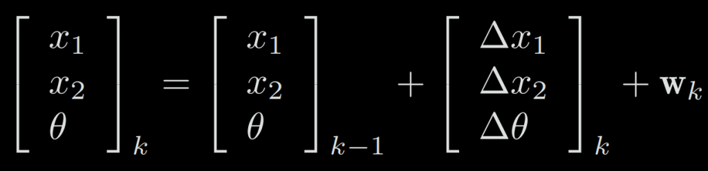 If a robot moves in a plane, then its pose is described by two x − y coordinates and an angle, i.e., xk = [x1, x2, θ], where x1, x2 are positions on two axes and θ is the angle. The motion equation can be parameterized as: