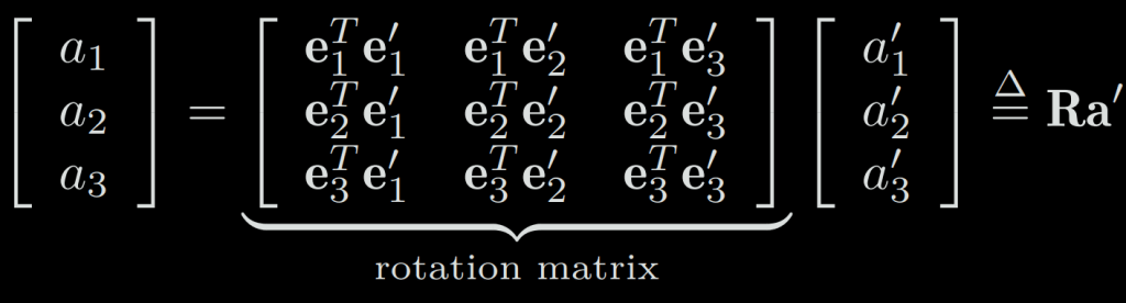 Let’s first assume we have two unit-length orthogonal bases (e1, e2, e3) and (e1′, e2′, e3′) corresponding to a simple rotation. Then, for a vector a, its coordinates in these two coordinate systems will be [a1, a2, a3] and [a1′, a2′, a3′]. Because the vector itself has not changed, according to the definition of coordinates, there are:
