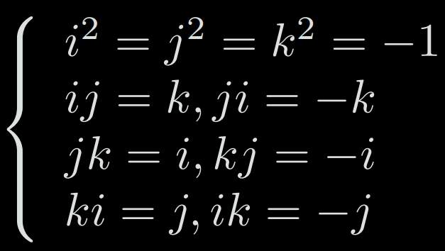 A quaternion q has a real part and three imaginary parts: q = q0 + q1.i + q2.j + q3.k with the relationships: