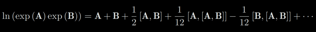 where [] is the Lie brackets. The BCH formula tells us that how to deal with the product of two matrices: they produce some extra Lie brackets compared with the scalar form.