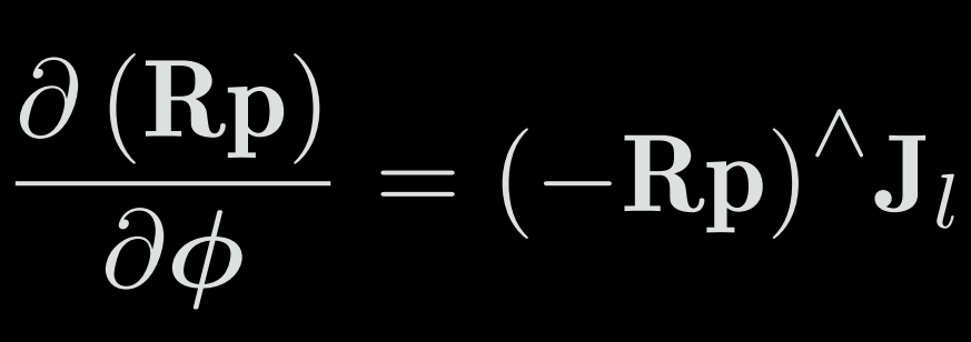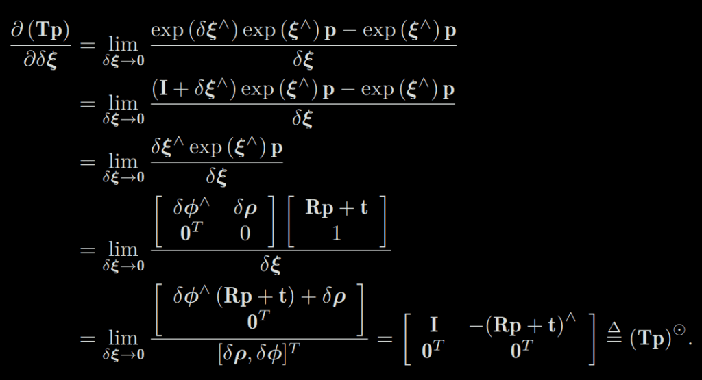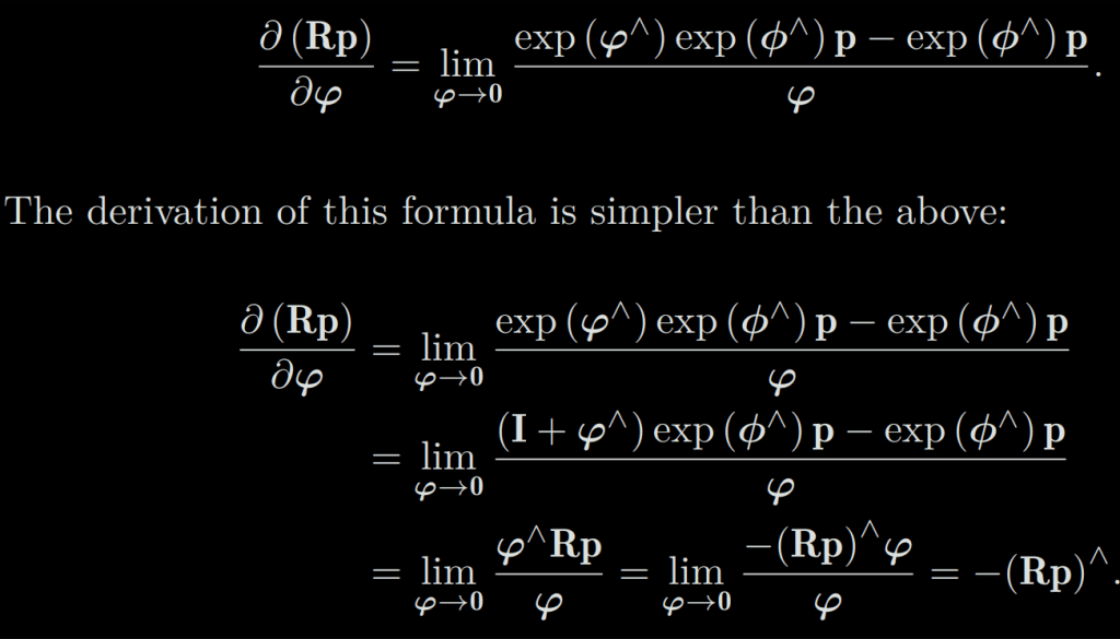 Another way to do this is to perturb R by ∆R and see the change of the result relative to the disturbance. This disturbance can be multiplied on the left or on the right. The final result will be slightly different. Let’s take the left perturbation as an example. Let the left perturbation ∆R correspond to the Lie algebra as φ. Then, for φ, that is: