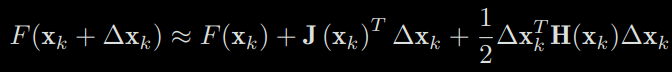 where J(xk) is the first derivative of F(x) with respect to x (also called gradient, Jacobi Matrix, or Jacobian), H is the second-order derivative (or Hessian), which are all taken at xk.