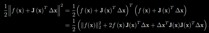 The Gauss-Newton method is one of the simplest methods in optimization algorithms. Its idea is to carry out a first order Taylor expansion of f(x). According to the extreme conditions, this time we set the derivative with ∆x to zero to reach the extreme value. To do this, let’s first expand the square term of the objective function: