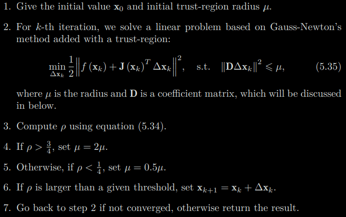 The approximate second-order Taylor expansion used in the Gauss-Newton method can only have a good approximation effect near the expansion point. So, we naturally thought a range should be added to ∆x, called trust-region. This range defines under what circumstances the second-order approximation is valid. This type of method is also called trust-region method. We think the approximation is valid only in the trusted region; otherwise, it may go wrong if the approximation goes outside.