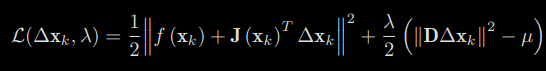 where λ is the Lagrange multiplier. Similar to the method in the Gauss-Newton, let the derivative of the Lagrangian function with respect to ∆x be zero, and we still need to solve the linear equation for calculating the increment.