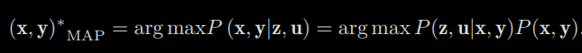 The left side is called posterior probability, and P(z|x) on the right is called likelihood (or likehood), and the other part is P(x) is called prior. It is normally difficult to find the posterior distribution directly (in nonlinear systems), but it is feasible to find an optimal point which maximize the posterior (Maximize a Posterior, MAP):