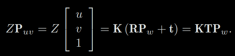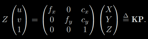 In the next equation, we refer to the matrix composed of the middle quantities as the camera’s inner parameter matrix (o intrinsics) K. It is generally assumed that the camera’s internal parameters are fixed after manufacturing and will not change during usage. Some camera manufacturers will tell you the intrinsics, and sometimes you need to estimate the internal parameters by yourself, which is called calibration: