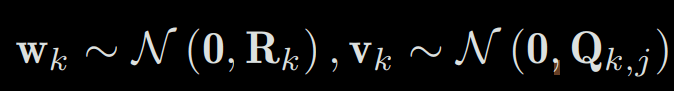 Now, consider what happens when the data is affected by noise. In the motion and observation equations, we usually assume that the two noise terms wk, vk,j satisfy a Gaussian distribution with zero mean, like this: