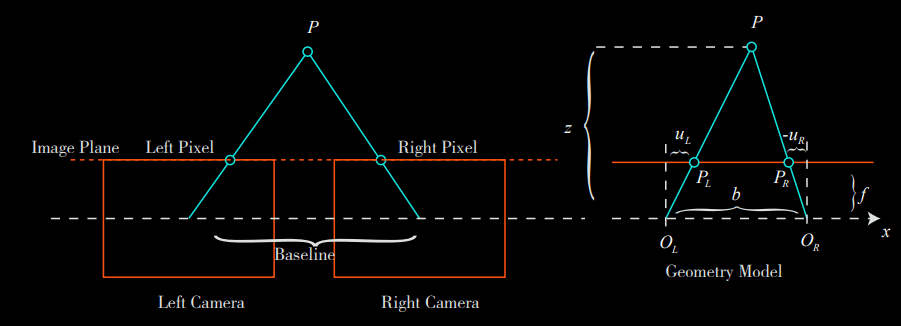A binocular camera is generally composed of a left-eye camera and a right-eye camera. They are synchronized and placed horizontally, meaning that both cameras’ centers are on the same x axis. The distance between the two centers is called baseline (denoted as b), which is an important parameter: