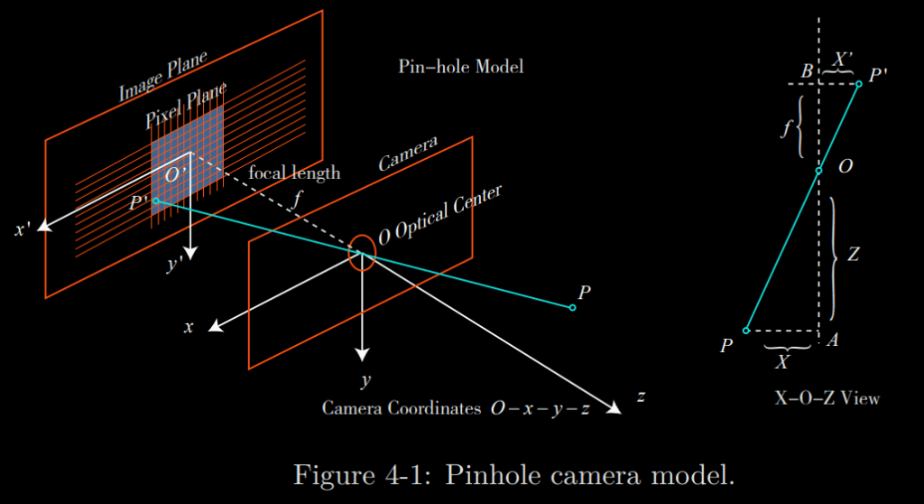 The next formula describes the spatial relationship between the point P and its image, where the units of all points are meters. For example, a focal length maybe 0.2 meters, and X′ be 0.14 meters. However, in the camera, we end up with pixels, where we need to sample and quantize the pixels on the imaging plane. To describe how the sensor converts the perceived light into image pixels, we set a pixel plane o − u − v fixed on the physical imaging plane. Finally, we get pixel coordinates of P’, in the pixel plane: [u, v]^T: