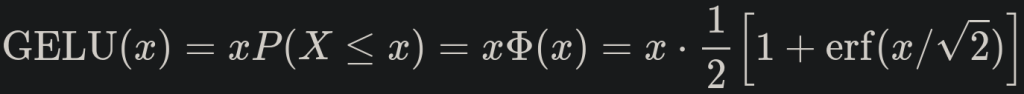 The GELU activation function is xΦ(x), where Φ(x) the standard Gaussian cumulative distribution function. The GELU non-linearity weights inputs by their percentile, rather than gates inputs by their sign as in ReLUs. Consequently the GELU can be thought of as a smoother ReLU (from paperswithcode):
